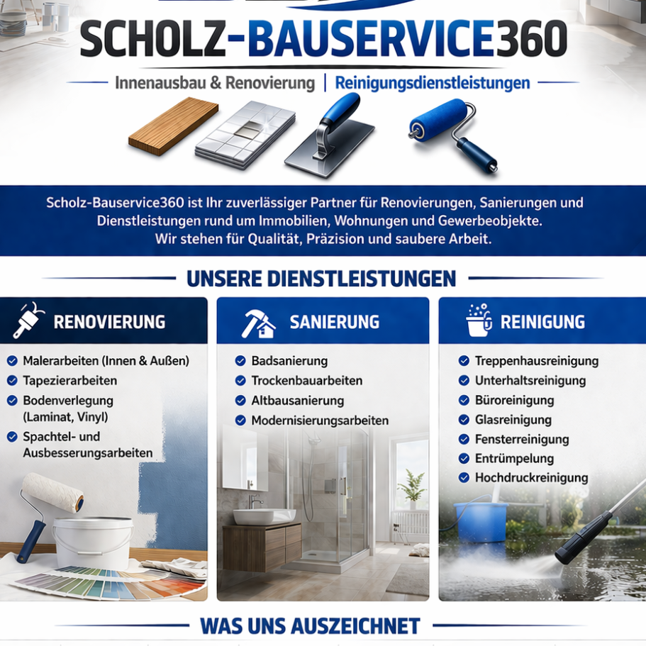 Willkommen bei Scholz-Bauservice360, Ihrem erfahrenen Partner für Objektreinigung, Treppenhausreinigung, Kellerreinigung und Bauendreinigungen in Leipzig. Unser Team ist reaktionsschnell und kundenorientiert, um sicherzustellen, dass Ihre Reinigungsbedürfnisse nicht nur erfüllt, sondern übertroffen werden. Bei jeder Reinigungsaufgabe legen wir Wert darauf, dass unsere Dienstleistungen stämmig und wirkungsvoll sind, sodass Sie sich in Ihren Räumlichkeiten wohlfühlen können. Vertrauen Sie auf unsere Expertise, um Ihre Räume sauber und einladend zu halten!